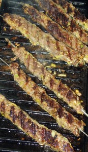 Mix a pound of ground lamb (or ground beef) with finely diced leeks (or onions), 2 tablespoons softened butter, chopped garlic, smoked paprika (I’m addicted to this stuff), chopped fresh rosemary, chopped fresh mint. Form the meat mixture around a metal kebab skewer, about as thick as your big toe. I cooked them on a hot cast iron grill pan, but I’m sure they’d be better on a grill, turning frequently until cooked on all sides. I served it on a whole wheat tortilla, with a little salad mix, some chopped red onion, and mayonnaise, but yogurt and pita bread is much more traditional.