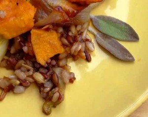 This recipe is a mixture of rich, tender roasted pumpkin, flavorful root vegetables, and earthy lamb and wild grains, and is based on something I saw in the October ’08 Everyday Food magazine. In their version, it’s rigitoni instead of rice, and it’s goat cheese instead of chunks of braised lamb shank.
